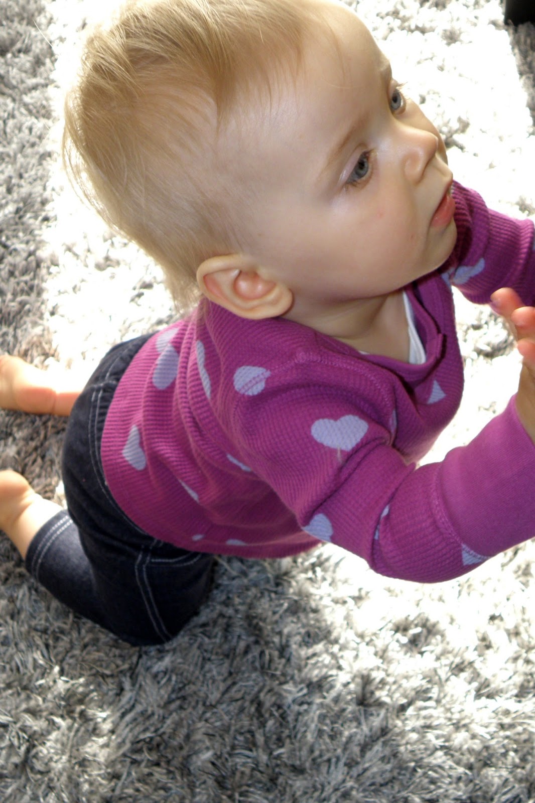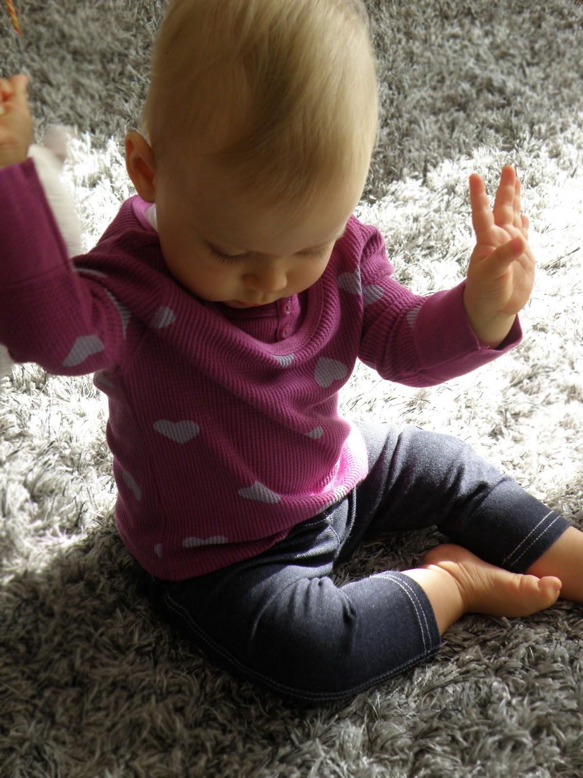 Bowiem, gdy tylko raz odważyła się wstać na kolanka i iść, ruszyła na całego. Nie boi się niczego. Śmiga z pokoju do pokoju z prędkością mrugnięcia oka 😉 Zwiedza domek dokładnie, zaglądając w każdy kąt. Łapie się wszystkiego, co spotka na swej drodze i podciąga się. Myk i już na kolankach stoi szczęśliwa, że się udało. Kilka wygibasów bioderkami i pędzi dalej.Z każdym dniem Dzidziulka wprowadza nowe pozy. Ulubiona to stawanie na głowie i patrzenie na świat do góry nogami. Na razie niepewnie staje na nóżki, ale przecież jeszcze ma czas…