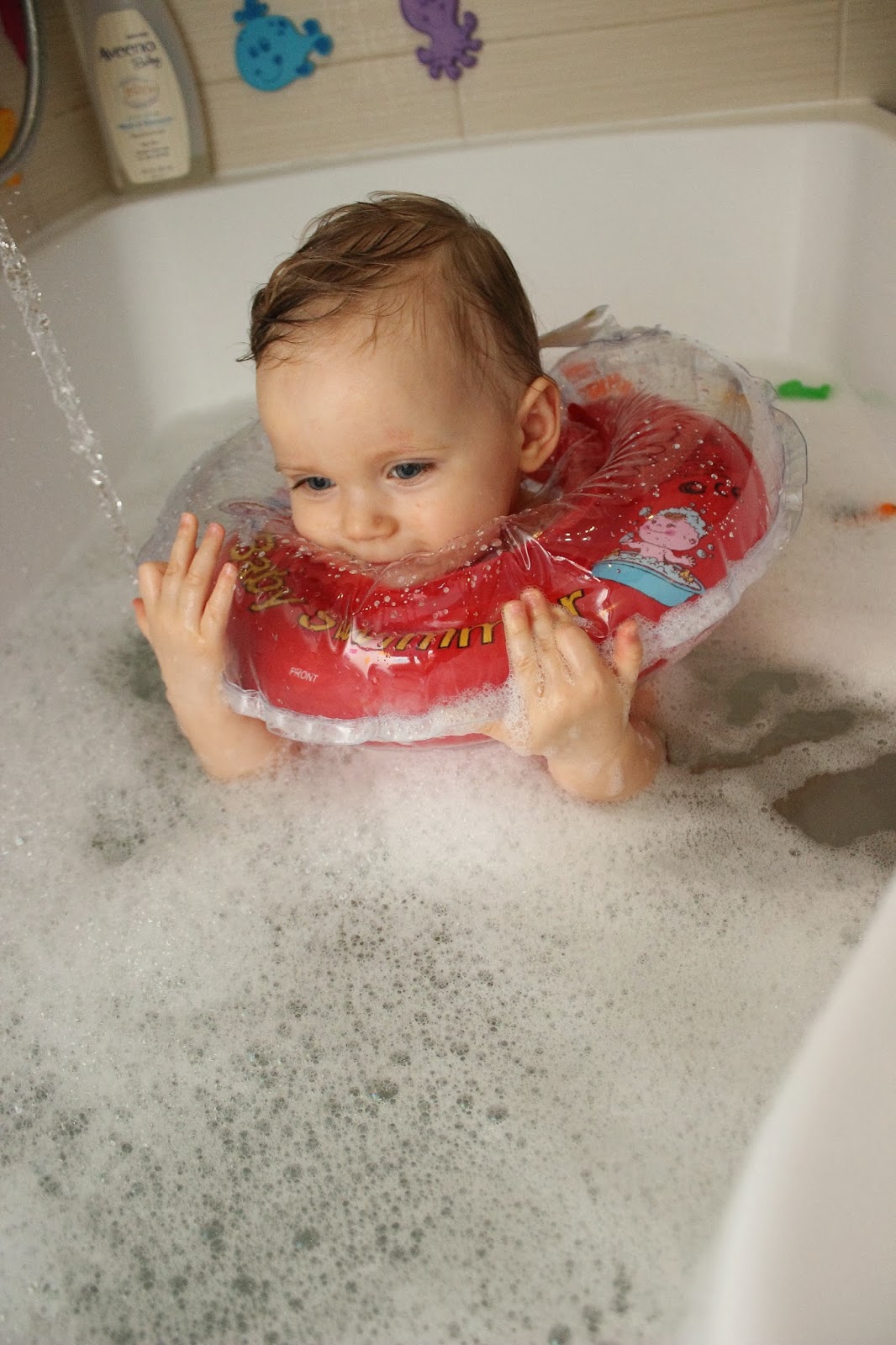 Testowanie kołnierza rozpoczęliśmy w domku, w wannie. Zgodnie z instrukcją, daliśmy Dzidziulce trochę czasu na oswojenie się z kołnierzem. Najpierw bawiła się nim w salonie na dywanie. Kołnierz bardzo ją zainteresował. Bez problemu nawet dała sobie go przymierzyć. Później zabraliśmy kołnierz ze sobą do łazienki. Dzidziulka kąpie się codziennie i uwielbia zabawy w wodzie. Ma kilka zestawów zabawek do kąpieli, które naprzemiennie używa. Gdy chcieliśmy założyć jej kołnierz Dzidziulka zareagowała oburzeniem. Kiedy jednak weszła do wanny wypełnionej wodą po chwili zupełnie o nim zapomniała. Do codziennej kąpieli nie nalewamy całej wanny wody między innymi z uwagi na niebezpieczeństwo, jakie niesie zabawa w takiej głębokiej wodzie. Woda wypychała Dzidziulkę i miała problem z zachowaniem równowagi. Wydaje mi się, że kąpiel (połączona z zabawą) bez kołnierza w tym wypadku byłaby wręcz niemożliwa. Kołnierz pomagał utrzymać Dzidziulce równowagę. Choć rączki miała wolne, kołnierz sprawiał, że miała ograniczoną widoczność swoich zabawek, co natomiast znacznie utrudniało zabawę.