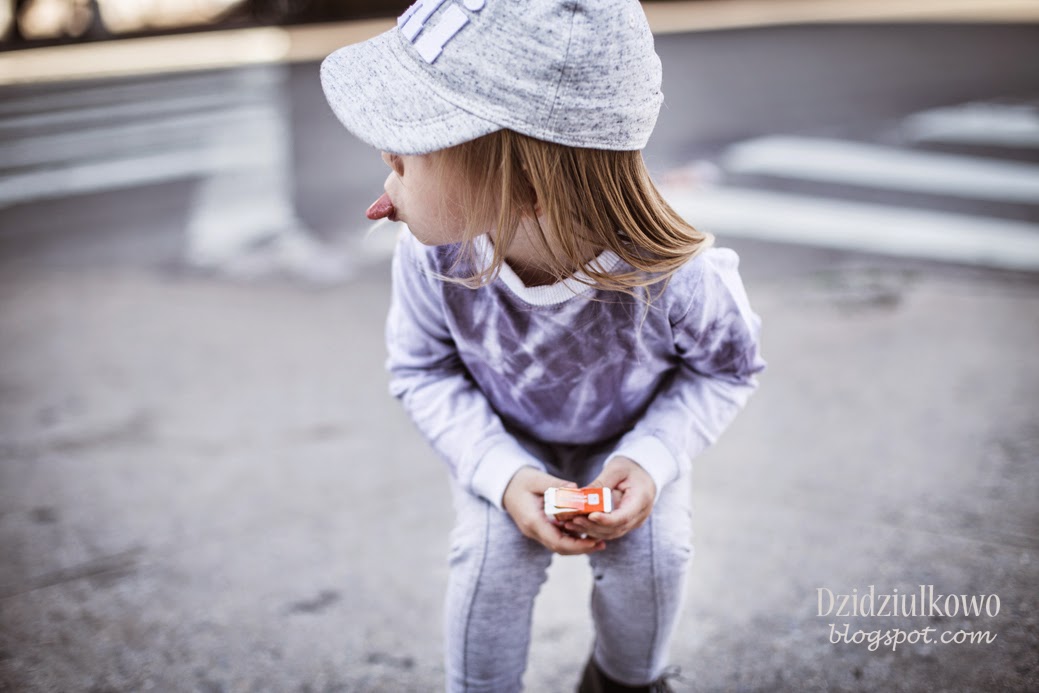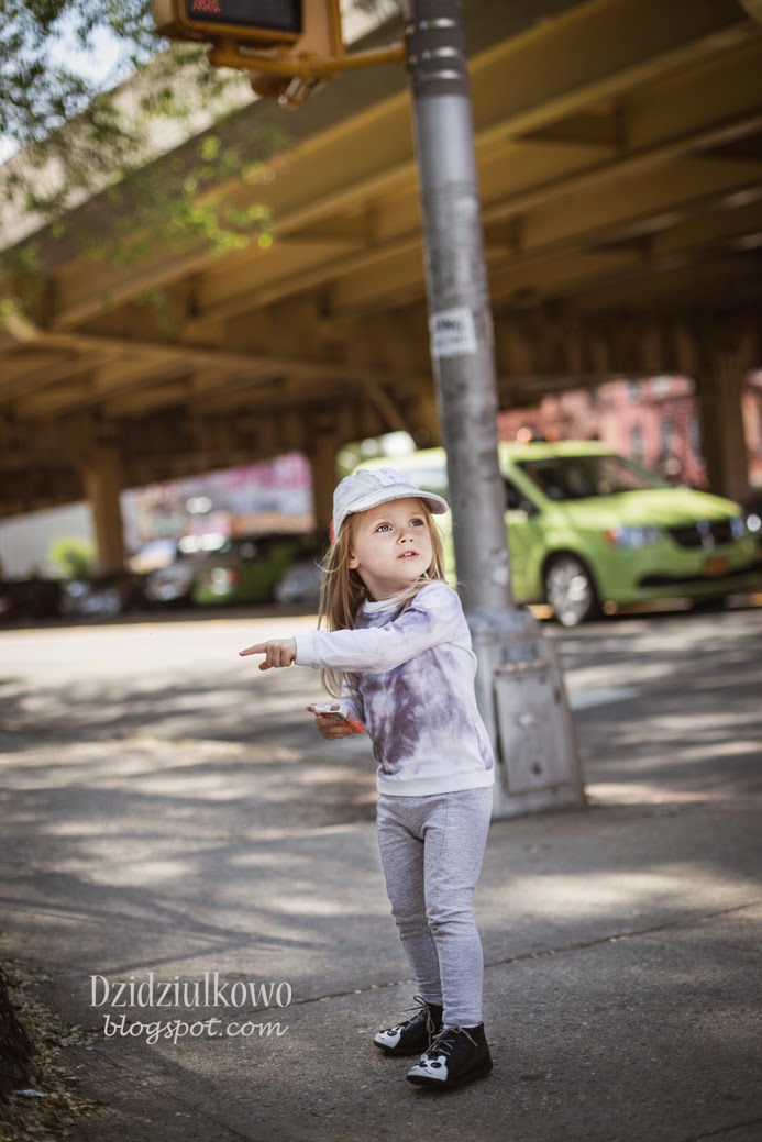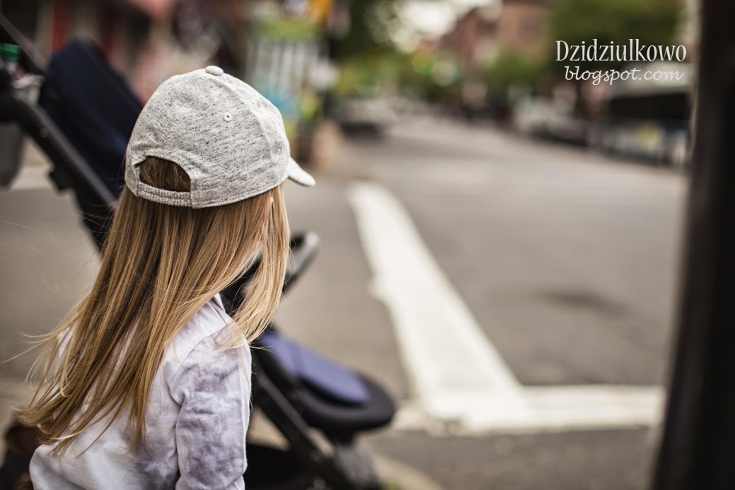 Uwielbiam moją Dzidziulkę ubraną w tiule. W jej szafie od dawna mnóstwo tiulowych spódniczek, zresztą nie tylko tiulowych. Pokazywałam Wam, że tiulówkę i do bluzy nosić można (o tutaj – KLIK). Ale przyznać muszę, że taką Dzidziulkę w wersji ‘chłopczyca’ także bardzo polubiłam. Bluzę skubnęła bratu – bo się wydała dla niego nieco przy duża. Nie wiem, czy to ten daszek czy ten czarujący uśmiech, który ukradkiem pojawiał się pod nim, czy może ten błysk w oku, takiej rozrabiary, który włączył się tego dnia… Dzidziulka szła żwawo, uśmiechnięta, nie patrząc za bardzo na słowa rodziców, którzy co chwila na zmianę krzyczeli: stój, czekaj, ulica, uważaj, w prawo, zaczekaj, nie biegnij, ostrożnie, no stój, w lewo, uwaga, stop, Juliaaaa… Już Wam mówiłam, o tutaj KLIK, jak to ludzie uśmiechnięci chodzą. Nowojorczycy, a może po prostu amerykanie, nie kryją swoich emocji. Bez ogródek mówią, kiedy coś im nie pasuje, np. palenie w ich obecności. Ale i nie kryją pozytywnych uczuć. Tego dnia Dzidziulka zebrała więcej komplementów niż ja w tym roku w ogóle. Każda mijająca nas osoba musiała skomentować tę chodzącą słodycz. Usłyszeliśmy jaka to jest cute, sweet, adorable, amazing, a pewien pan stwierdził nawet, że wygląda jak ‘movie star’. Kiedy kucałam by zrobić zdjęcie, przechodzący niedaleko ludzie zamierali na chwilę. Wszyscy zatrzymywali się by popatrzeć, jak by działo się coś niezwykłego. Dzidziulka choć nie bardzo rozumiała, zawstydzała się, ale po chwili spod daszka wyłaniał się ukradkiem najpięknieszy uśmiech.