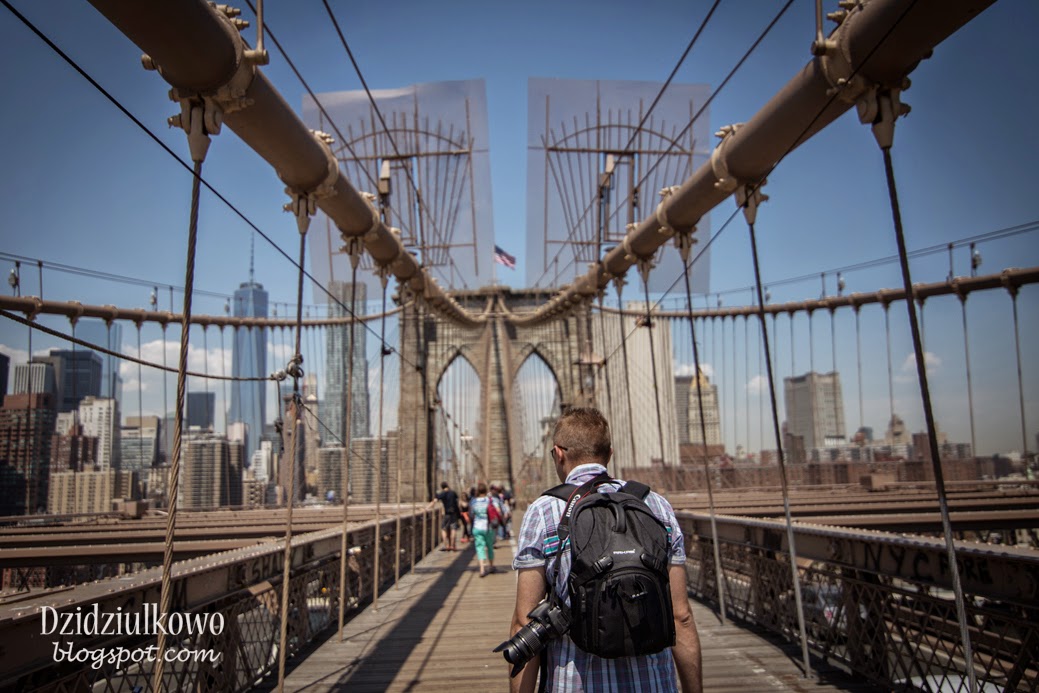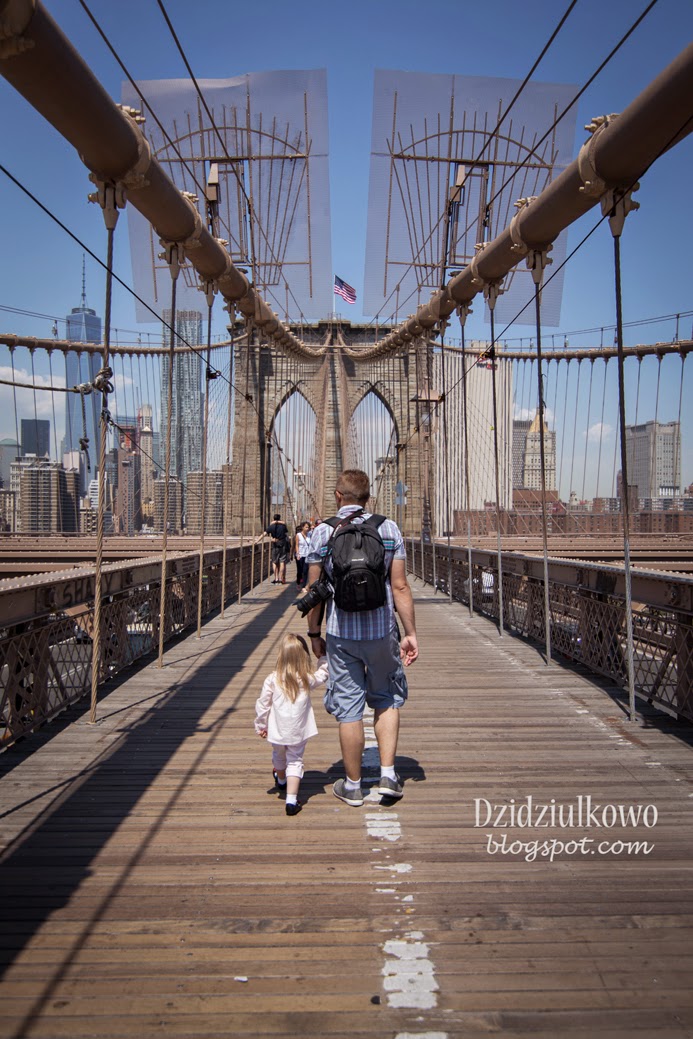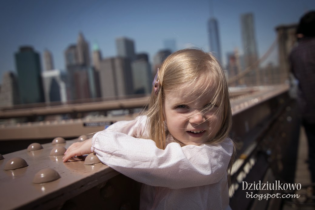 Kolejna znana na całym świecie ikona Nowego Jorku. Brooklyn Bridge to jeden z najstarszych wiszących mostów. Łączy dwie dzielnice Brooklyn i Manhattan, a tyci nóżki Dzidziulki przeszły prawie calutki, 1834 m, to pewnie jakieś pięć tysięcy albo i więcej dzidziulkowych kroczków. Często turyści dochodzą do połowy i zawracają albo wypożyczają rowery i most pokonują na dwóch kołach. Jest to całkiem dobre wyjście dla nie rodziców. Kiedyś, spacerując po tym moście podziwiałam widoki, dziś ciężko było mi się na nich skupić, bo Dzidziulka odważnie zwiedzała, zaglądając, wyglądając gdzie się da, a nawet mówiła, że chciałaby wskoczyć do wody. A przecież most wisi ponad czterdzieści metrów nad wodą. Spacer ten przekładaliśmy kilka razy ze względu na pogodę. Swoją drogą, wiosna w Nowym Jorku w tym roku jest wyjątkowo kapryśna. Na szczęście udało nam się trafić na upalny dzień, wiatr zatem zamiast dokuczać przynosił ulgę. Dzidziulkowe buźki już nawet zdążyły się opalić. Spacer po Brooklyn Bridge to obowiązkowy punkt na liście miejsc do zwiedzenia w Nowym Jorku. Trzeba jednak dobrze się do niego przygotować. Źle wybrana godzina oraz nieodpowiednia pogoda nie da się nacieszyć widokami, a te są naprawdę nie do opisania. Zdjęcie mostu od razu po powrocie wędruje na ścianie, by przypominać nam tę wyprawę. Mimo, że patrząc pod nogi, pomiędzy deskami, w tyci szparach widać poruszające się po moście auta, co z kolei powoduje zawroty głowy, a ponadto most drga i brzęczy, kiedy jest większy ruch samochodowy, to mimo wszystko jest to jedna z atrakcji, którą wspominamy najmilej. Zapraszam na fotorelację. A Wy macie lęk wysokości?