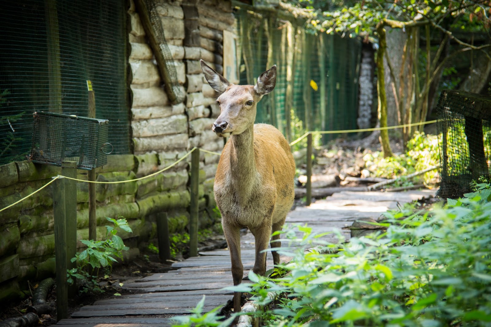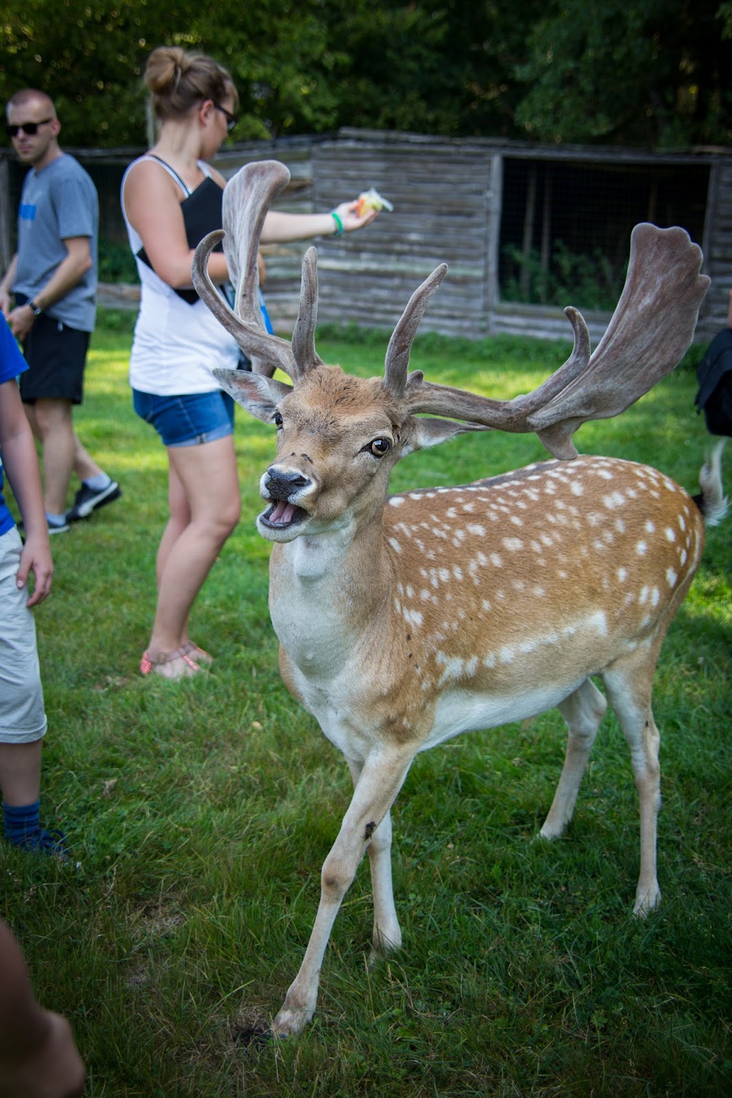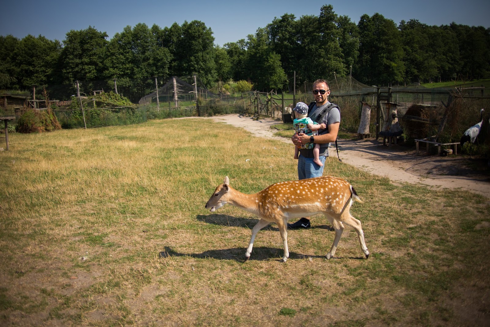 Kozy, osiołki to raczej mało ‘dzikie’ zwierzęta powiedziałabym. Ale tego dnia przekonałam się, że jednak może być różnie. Wchodzimy do zagrody. Tak, do środka. Na wybiegu, będącym ogromną łąką, w otoczeniu lasu, mieszkają sobie kozy i osiołki. Razem. Kucam sobie, by zrobić zdjęcie, aż tu nagle, coś wielkiego podchodzi do mnie i zagląda przez moje ramię, a następnie obciera się o mnie, niczym kot dopominający się głaskania. Odskakuję na bok. O to tylko osiołek, jaki słodki. A już widzę, że Dzidziulkowego Tatę z Domisiem na brzuchu również goni jakiś nowy ‘przyjaciel’. Dzidziulka zaś z Babcią za rękę krzyczy, że nie chce tych zwierzątek, uciekając jak najdalej, a kozy i osiołki, twardo dotrzymują im kroku. Dzikusy, a nie zwierzęta. Biedne one takie spragnione nie towarzystwa człowieka, a jedzenia… Wychudzone kozy z żebrami, które policzyć można gołym okiem, dopominają się czegokolwiek do przegryzienia, jakby wcale nie były karmione. Odprowadzają więc ludzi pod samą furtkę, licząc, że coś im się dostanie. A są przy tym bardzo nachalne. Dlatego choć zwierzęta są zaprzyjaźnione z człowiekiem, trzeba mieć oczy dookoła głowy. Łania, która niby tylko szła sobie wzdłuż szlaku, co raz schyliła się spróbować włosów małych dziewczynek, a nawet nadeptując jednego ze zwiedzających, byle tylko zwrócić na siebie uwagę i dostać coś do jedzenia.