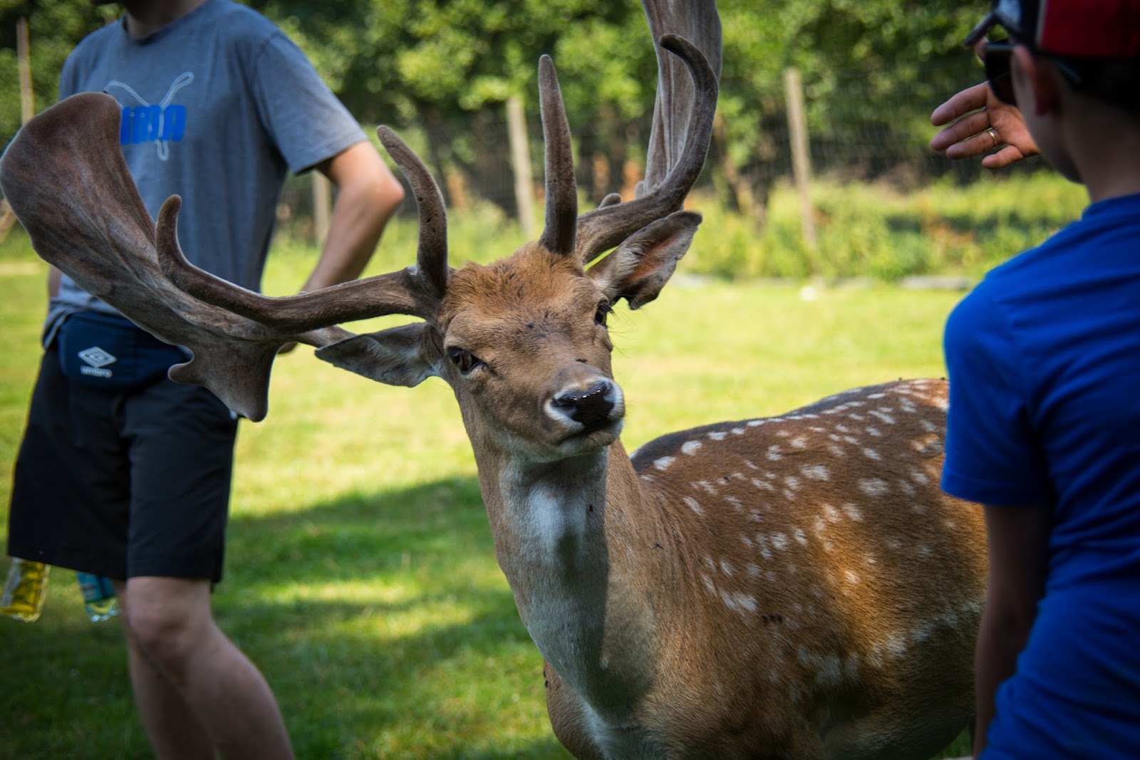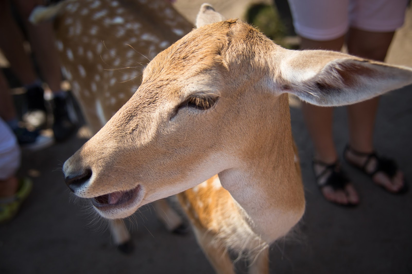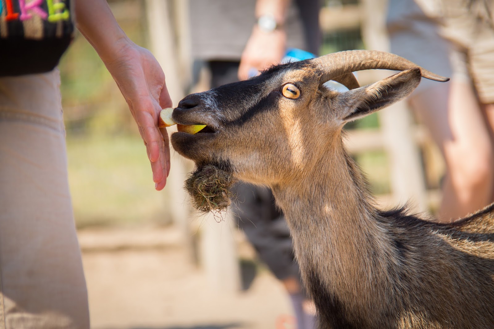 Kozy, osiołki to raczej mało ‘dzikie’ zwierzęta powiedziałabym. Ale tego dnia przekonałam się, że jednak może być różnie. Wchodzimy do zagrody. Tak, do środka. Na wybiegu, będącym ogromną łąką, w otoczeniu lasu, mieszkają sobie kozy i osiołki. Razem. Kucam sobie, by zrobić zdjęcie, aż tu nagle, coś wielkiego podchodzi do mnie i zagląda przez moje ramię, a następnie obciera się o mnie, niczym kot dopominający się głaskania. Odskakuję na bok. O to tylko osiołek, jaki słodki. A już widzę, że Dzidziulkowego Tatę z Domisiem na brzuchu również goni jakiś nowy ‘przyjaciel’. Dzidziulka zaś z Babcią za rękę krzyczy, że nie chce tych zwierzątek, uciekając jak najdalej, a kozy i osiołki, twardo dotrzymują im kroku. Dzikusy, a nie zwierzęta. Biedne one takie spragnione nie towarzystwa człowieka, a jedzenia… Wychudzone kozy z żebrami, które policzyć można gołym okiem, dopominają się czegokolwiek do przegryzienia, jakby wcale nie były karmione. Odprowadzają więc ludzi pod samą furtkę, licząc, że coś im się dostanie. A są przy tym bardzo nachalne. Dlatego choć zwierzęta są zaprzyjaźnione z człowiekiem, trzeba mieć oczy dookoła głowy. Łania, która niby tylko szła sobie wzdłuż szlaku, co raz schyliła się spróbować włosów małych dziewczynek, a nawet nadeptując jednego ze zwiedzających, byle tylko zwrócić na siebie uwagę i dostać coś do jedzenia.